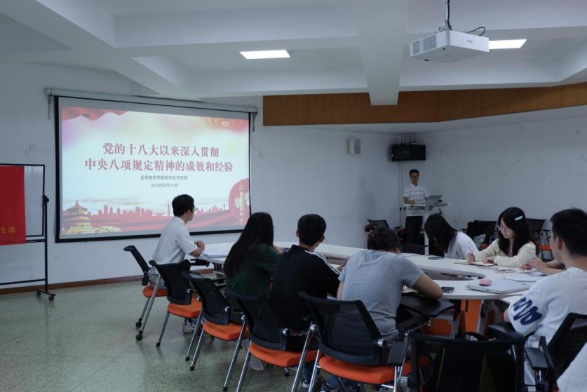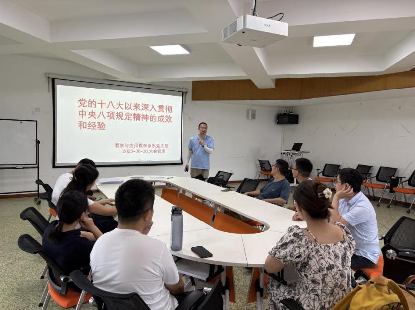 院长周钰谦以《深入贯彻中央八项规定精神学习教育》为题,为数学与应用数学系党支部开展专题党课,周钰谦深入浅出解读中央八项规定及其实施细则,结合自身学习与工作实践,阐述厉行勤俭节约、反对奢侈浪费和奢靡之风、廉洁从政、工作作风务实的精神实质,并通过案例剖析,教育党员知敬畏、存戒惧、守底线。