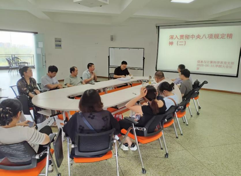 信息与计算科学系党支部6月5日于航空港校区6409会议室开展集中学习。支部书记魏其矫带领支部党员学习《党的十八大以来深入贯彻中央八项规定精神的成效和经验》,系统回顾党的十八大以来的作风建设成果和经验,组织委员刘刚领学新修订的《中国共产党纪律处分条例》,重点强调新型腐败界定、学术不端处分标准等内容。同时,会议严格按照程序审议郭静那入党事宜,经无记名投票全票通过,接收其为预备党员。6月10日,信息与计算科学系党支部组织开展深入贯彻中央八项规定精神学习教育。会上,胡建成副院长分享了学习心得,他强调,教师应严格遵守党的纪律和规矩,以案为鉴,杜绝违规行为,加强师德师风建设,做好表率作用,营造风清气正的育人环境。