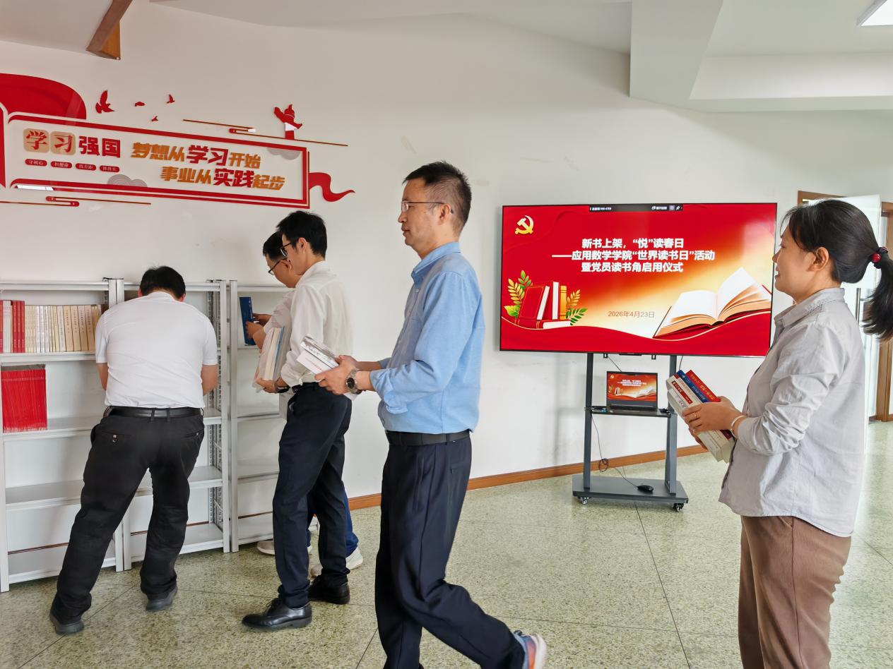 教师代表共同为全新党员读书角完成新书上架与书籍整理工作。崭新的书籍整齐陈列于书架之上,内容涵盖党的创新理论、教育教学研究、数学专业经典著作、人文社科精品等多个门类,为风月同天